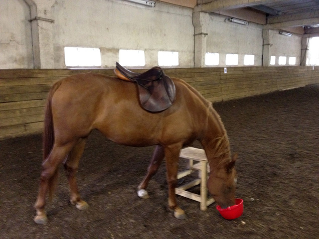А в-третьих, Варя сегодня впервые померила седло! Причем она вообще его увидела впервые в жизни. В начале занятия я поставила седло на табуретку в центре манежа и засунула пару морковок между крыльями.