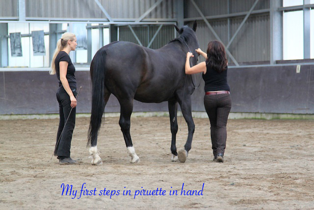 С Варей у меня была другая история - она очень много моих жестов знает, в том числе уступку задом внутрь вдоль стенки манежа. Ей никак не удавалось понять, что еще я от нее требую, поэтому я пошла более длинным путем - дала ей больше времени, чтобы развить гибкость, чтобы ей не пришлось действовать через усилие, и в один прекрасный день у нас все получилось.