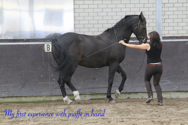 Я уже думала, что после пиаффе под верхом удивлять меня нечем.. Ошиблась! Пиаффе в руках! Оооо, я внутренне ликовала! Это просто чудесно - лошадь слушается каждого твоего жеста и легкого туширования, собирается, конденсируется и пиаффирует. Продвижение вперед настолько поддается контролю! Никаких рывков, Марайка говорит - продвинь, я продвигаю и Романеск расширяет темп, Марайка говорит - на месте, и мы пиаффируем почти на месте.