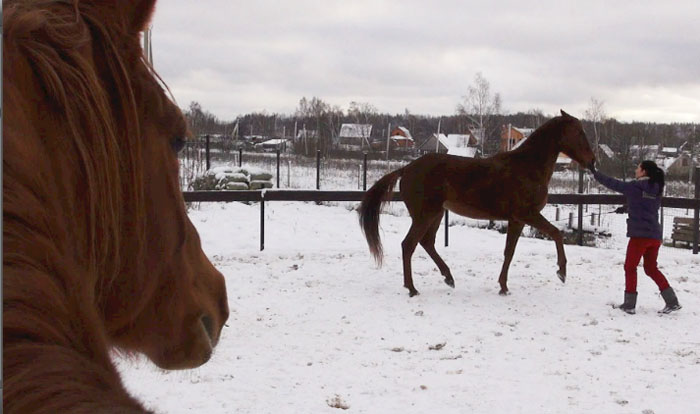 А еще я с ней играю такой трик - идем траверсом, и когда она подводит внешний зад под пузо, я прошу ее сделать жамбет внутренним передом. Понятно, что на подведенном заду свобода плеча лучше. И она мне такой испанский шаг выстреливает! Она уже стала связывать "подведение зада и свободу плеча" и в видео, когда она идет ИШ по кругу вокруг меня, видно, как она иногда неплохо подводит внешний зад, чтобы помочь себе. Н овсе равно, зад она малец отклячивает. Ну не андалуз, не андалуз, что ж поделать!
