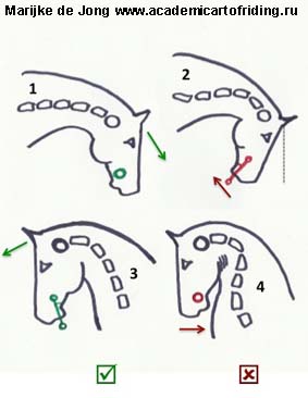 то имхо сбор спортивный не добровольный(слишком временные рамки велики) а значит состояние лошади уже не спокойно-уравновешенное. Плюс если добавить "поддержку" поводом, то акцент фокусируется на голове и челюсти. Если же идти путем свободы то сбор, лично я, желаю видеть добровольный и от зада. Если не зудеть над шеей и головой то и напряжения излишнего там появиться не должно.