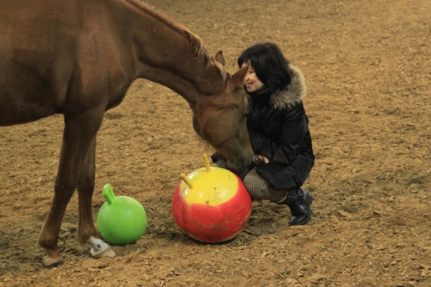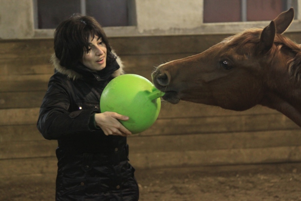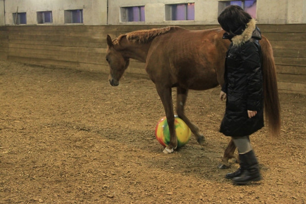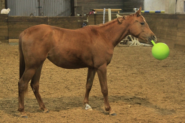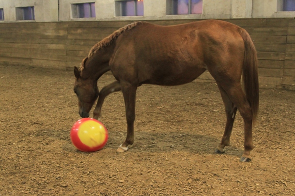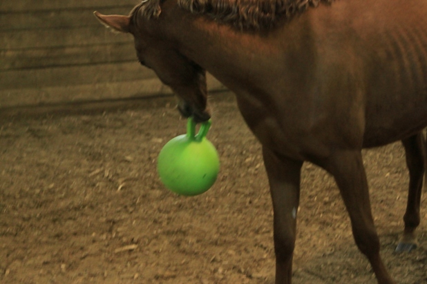 Она играла с мячиком раньше,у них в леваде был полусдутый,чтобы можно было зубами брать,мячик детский и они играли в него.И Варька пинала под себя,чтобы не отдавать псу,потому что как только кто-то из кобыл брался за мяч,пес прибегал и пытался отнять.Варька так его гоняла.Мячик под пузо себе,а на пса "крысу"