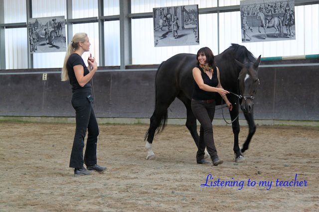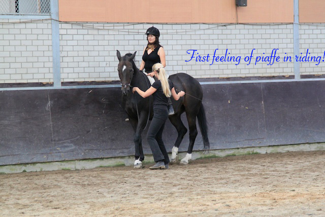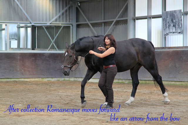 Марайка часто говорит о том, что лошадь, у которой правильно работает зад (задние ноги сильные, накачанные и работают, как пружины), если дать ей возможность двинуться вперед, полетит, как стрела из лука. Я раньше воспринимала это, как красивую метафору. Но на примере Романеска я поняла, что так оно и есть! Когда после выполнения упражнений, на которых он активно работал задом, я отпускала повод и просто шла вперед, он выстреливал, реально, как стрела. Нет, он не валился, не пер, не тащил - он размеренно, активно и широко шагал! Мне очень сложно объяснить словами, честно говоря... Он с огромным желанием двигался вперед, такой чистый импульс!