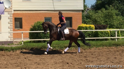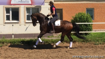 В работе не форсирован. Проходит базовую подготовку молодой лошади (переходы). Рабочие боковые и одиночная менка. Работает в обоих спортивных направлениях Конкур и Выездка.