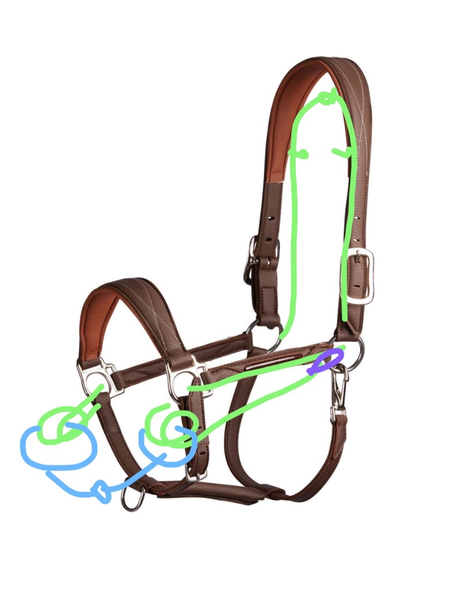 (картинка 3, фиолетовое - это карабин, а голубое - трензель)или управлять без железа, как на сайдпуле (картинка 2, фиолетовое - это повод). И недоуздок можно использовать и как обычный и как веревочный (картинка 1). Цель была сделать такую приблуду, что бы можно было доехать до выпаса, а там трензель отстегнуть и убрать в карман. Собственно, и саму веревку можно тоже вытащить и убрать, но по моим наблюдениям она не мешает, даже если не используется.