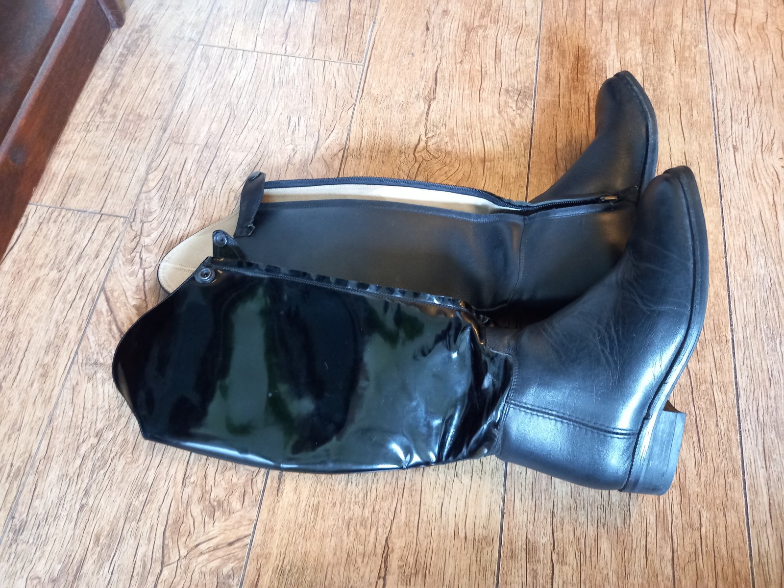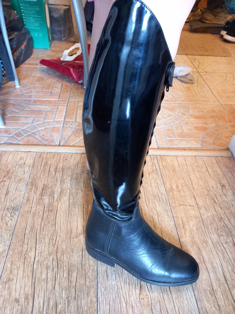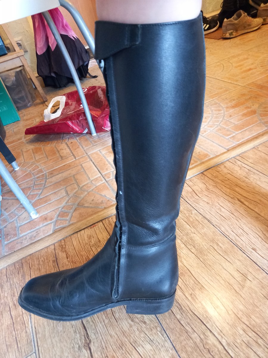 1. Сапоги выездковые лаковые размер 37. Икра 32-34 высота сзади 41. На достаточно узкую и тощую ногу. Состояние - одежды несколько раз. Шились на заказ.