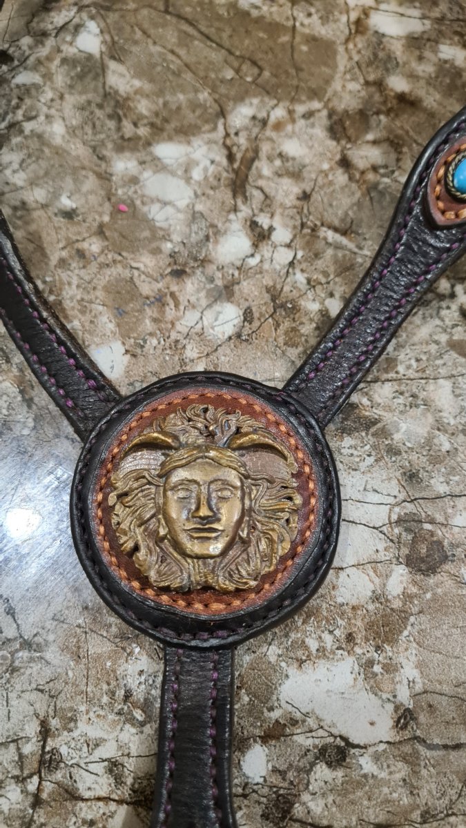 Продам комплект уздечка+нагрудник ручной работы (мастерская Маргариты Чулковой). Двухцветная натуральная кожа, вставки из бирюзы, бляха на нагруднике- "Горгона", бронза, отливалась специально для этого комплекта.