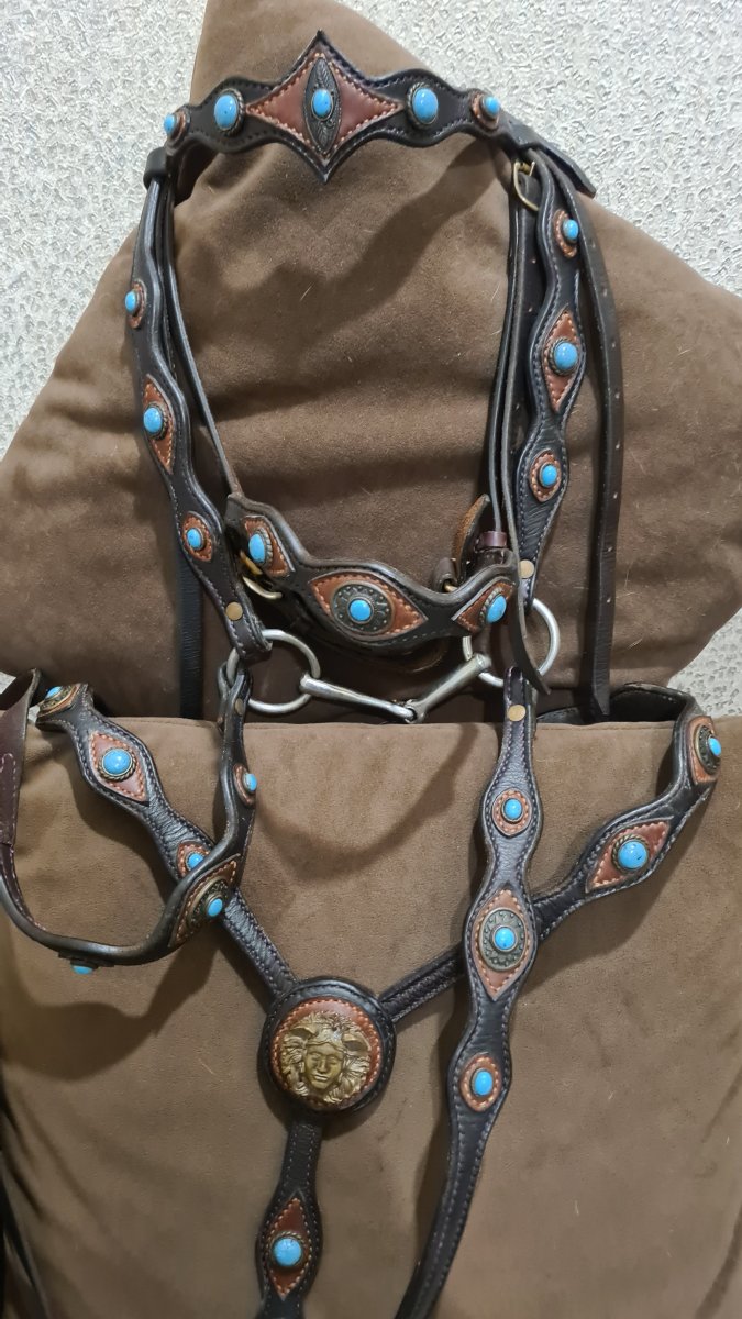 Продам комплект уздечка+ нагрудник на шетлендского пони. Ручная работа мастерской Маргариты Чулковой. Двухцветная кожа, вставки бирюзы, украшение для нагрудника "Горгона" отливалось из бронзы специально для этого комплекта.