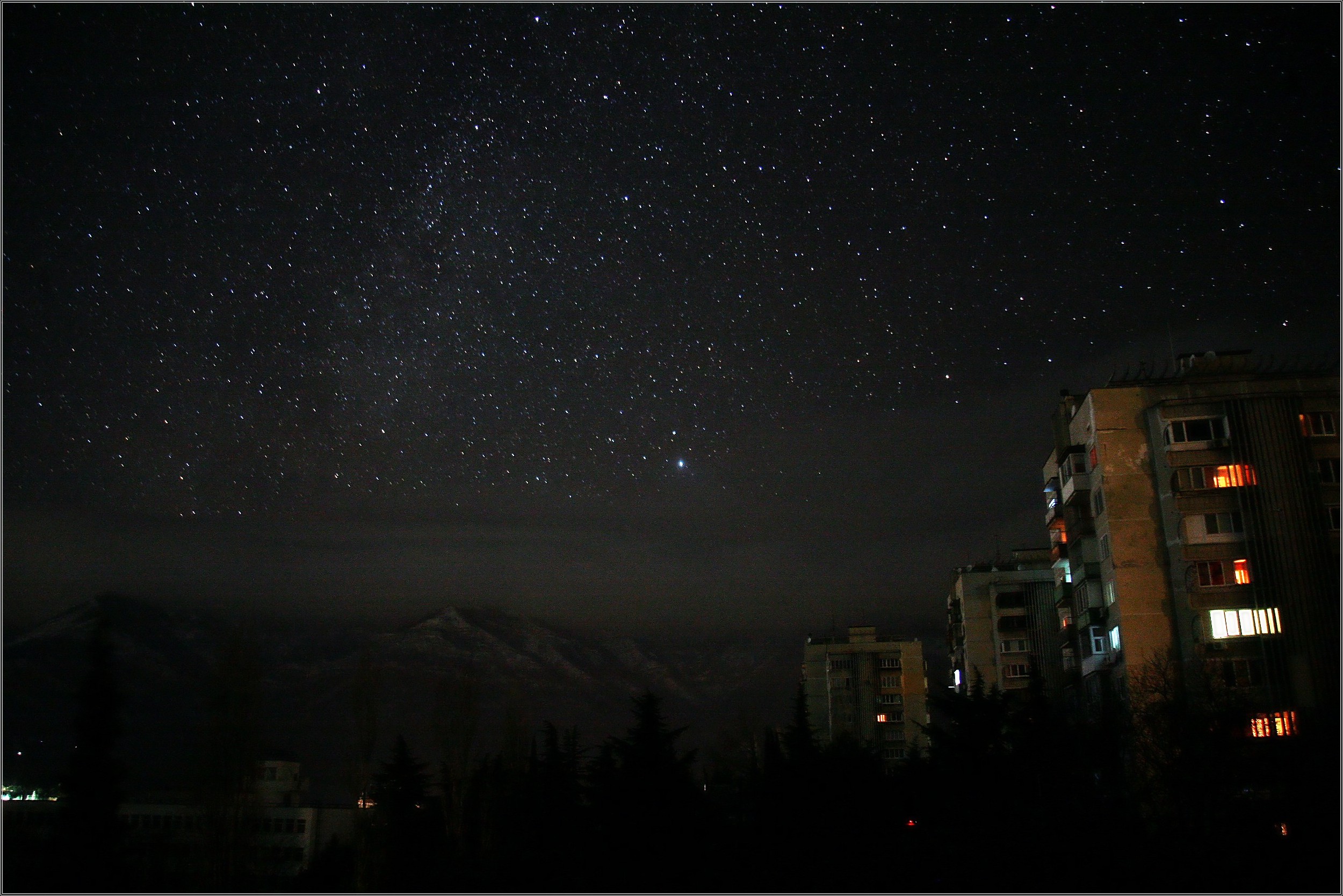 Привет! Ну конечно, самая главная новость, это то, что мы, наконец-то, получили немножко больше света. Конечно, его еще не достаточно, но все же стало получше. Особенно отдаленным районам. Есть такие, где вообще почти постоянно свет не выключают. Все по разному в разных районах Крыма. Что касается Ялты, то если выглянуть вечером из окна (а оно у меня как раз с видом на город) , то Ялта как и раньше горит огнями. Ну разве что их стало поменьше. Но говорить о полной тьме, как это постят на украинских пропагандистских форумах, конечно несерьезно. Тем не менее света стало меньше, световпя завеса над городом тоже отступила. И стали видны....ЗВЕЗДЫ...! Оказалось, что их над городом поосто миллиарды... космос....! А раньше-то не замечали. Фотографировала я прямо из окна своей лоджии, превращенной мною в кухню. Чему я, кстати, не перестаю радоваться каждый день, когда сижу за столом, пью кофе и любуюсь Ялтой, горами.....Стол стоит прямо перед окном , а из него открывается потрясный вид. Так что часто мое окошко дает мне возможность делать классные снимки не выходя из дому.