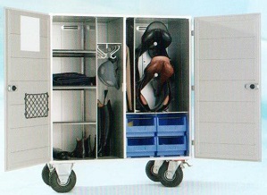 У нас все живет на конюшне, за исключением пары комплектов вальтрап+бинты,раздевалка крошечная с узеньким шкафом, поэтому вещи меняются в зависимости от сезона, но т.к. нас еще и двое на один шкаф, то вмещаемся с трудом.