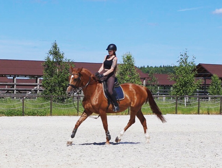 Хорошие движения, знает боковые элементы, менки, ранее ходила маршруты 120-130 см. на соревнованиях, 2 раза жеребилась (дала хороших крупных жеребят). На данный момент работает под выездку с тренером.