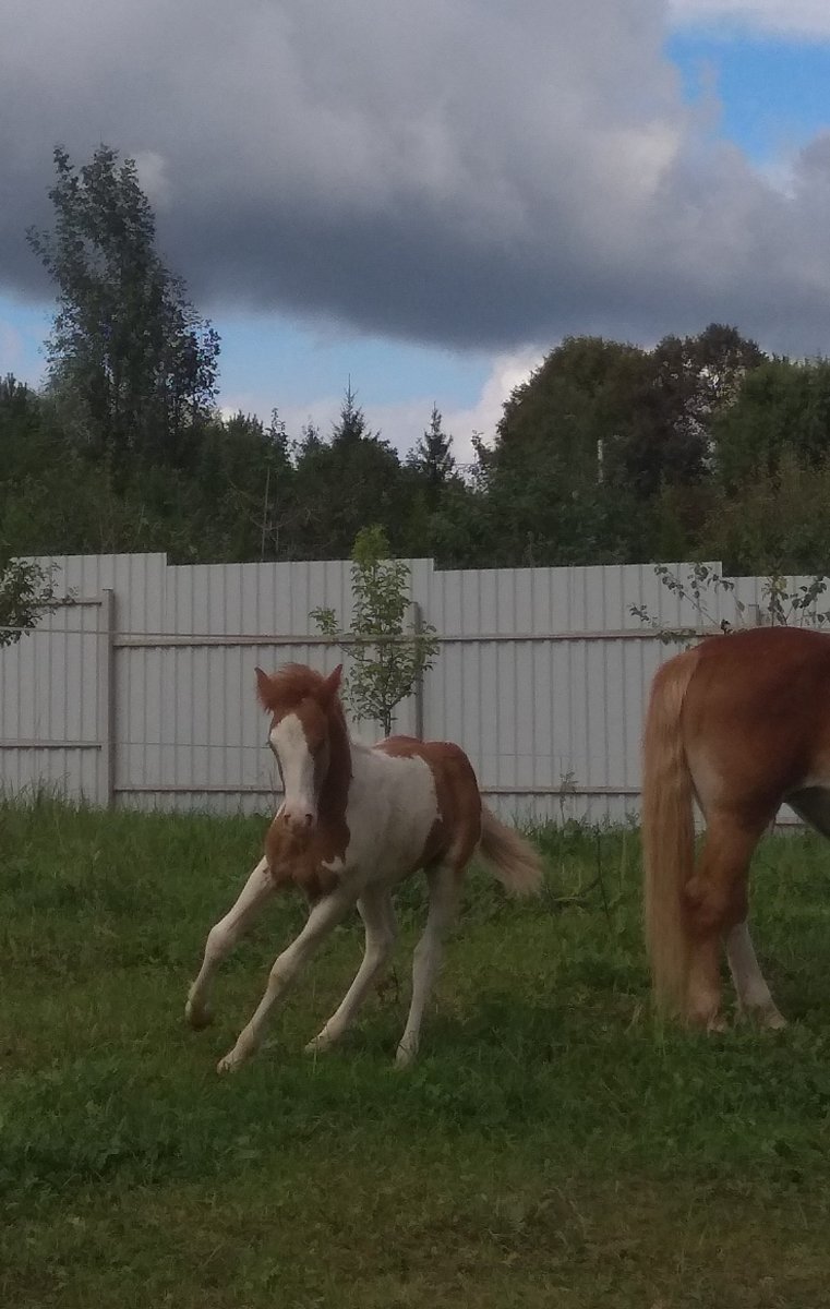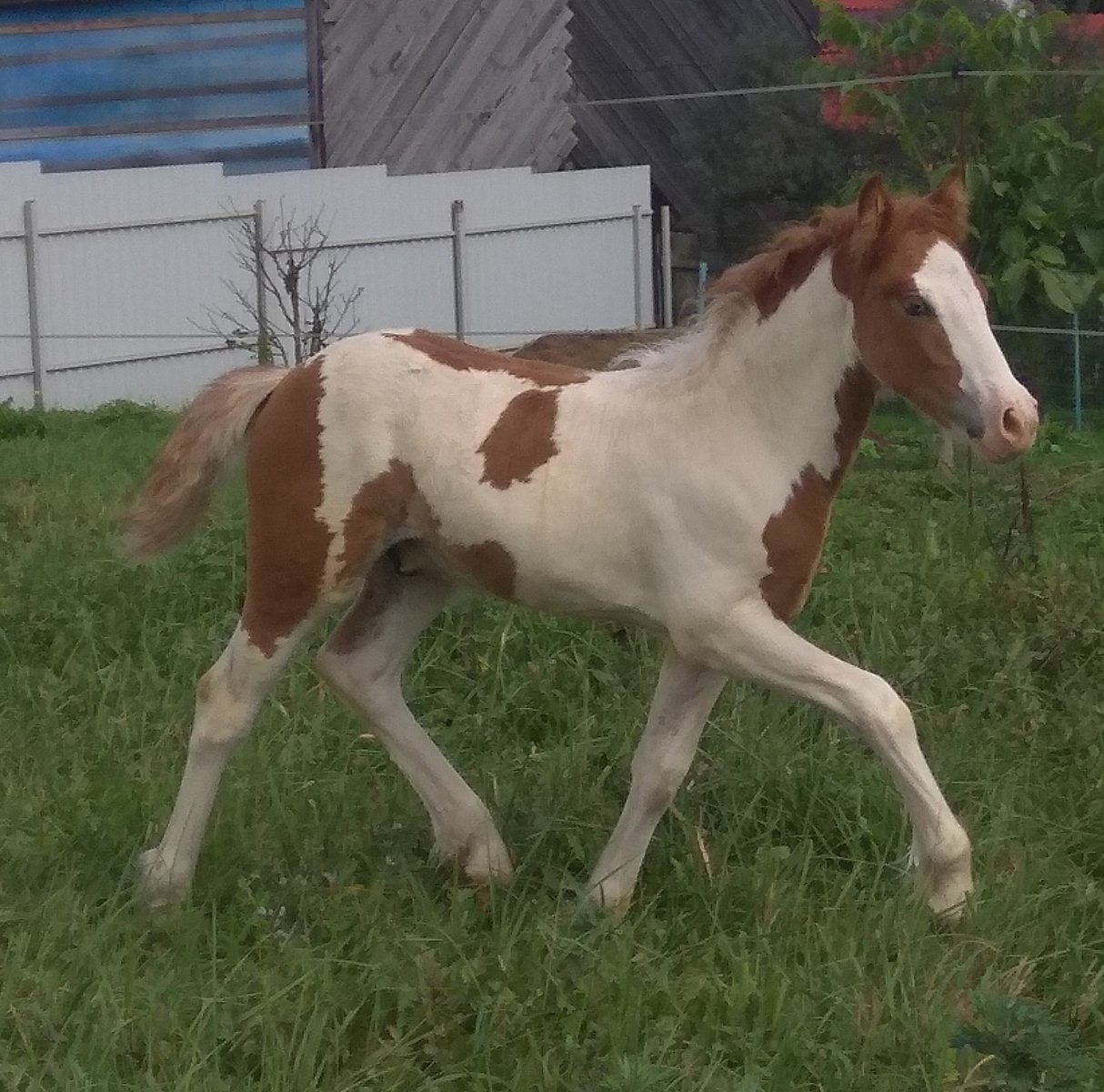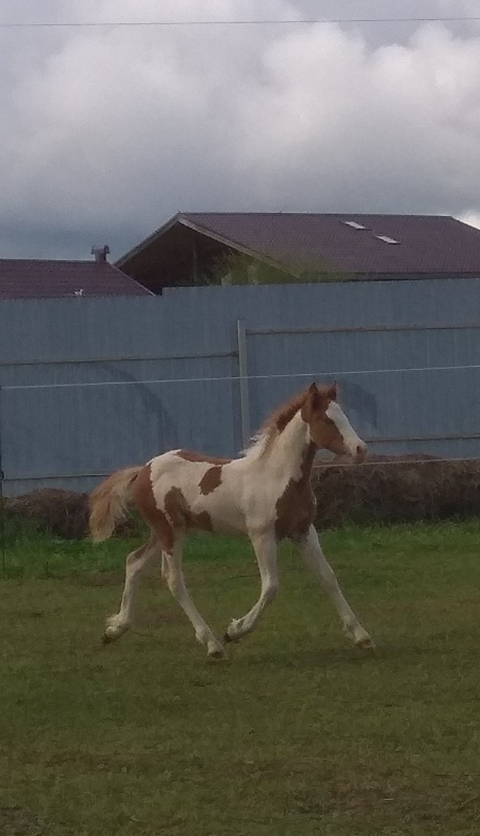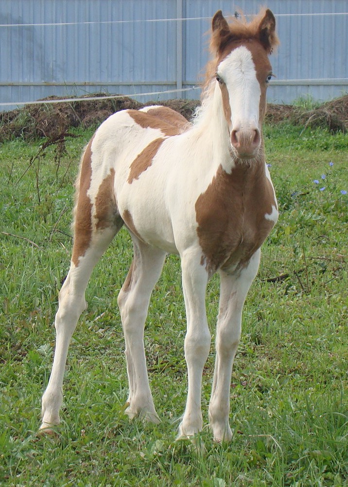 Стимул, голубоглазый рыже-пегий (с ОЗВ) жеребчик от тинкера и нарядной белогривой кобылы.