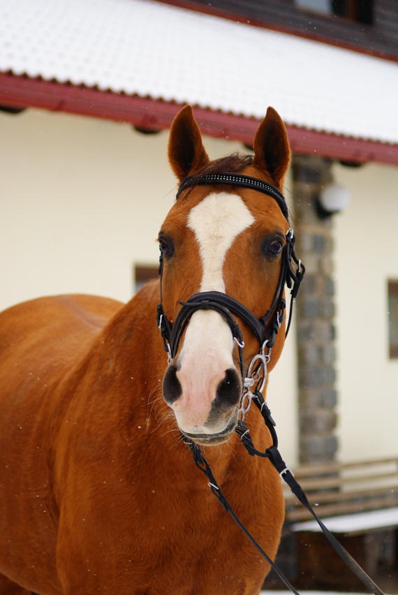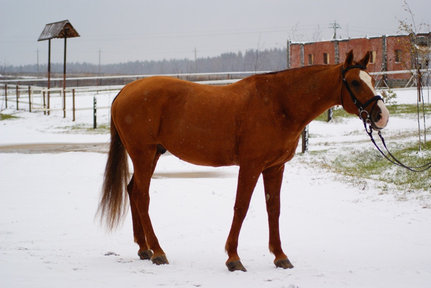 Одновременно с продажей Маркиза я занималась поиском другой лошади. Изучив бесконечное множество объявлений на сайтах, наткнулась на одно, которое встречала как минимум полгода назад. Но видимо хозяйка тогда передумала продавать и сняла его. А тут снова повесила. Поехали с мужем смотреть его в Раменский район. Каждые 10 минут нам звонила его владелица и рассказывала путь-дорожку к конюшне. В общем кое-как доехали. Хозяйка нас встретила очень радушно, даже выехала нам на встречу, чтобы мы не дай бог не заплутали в потемках. Месяц на дворе стоял февраль и время на часах показывало 8 вечера. Зашли в конюшню. Большая каменная постройка, в которой денников было примерно 40, если не больше. Все просторные, с высокими потолками. Единственный минус – неотаплеваемая, поэтому когда нам его вывели из денника он на первый взгляд показался мне мишкой. Итак, знакомьтесь: Донской мерин, 10 лет по кличке Гулан. Золотисто-рыжее чудо глядело на нас своими умными глазами, не понимая что собственно происходит. Его почистили, точнее смахнули, потому что лоск видно еще до нашего приезда навели. Поседлали и пошли в манеж. Сперва села подруга хозяйки, берейтор, МС по выездке. Сделав пару кругов разным аллюром подъехала ко мне и бодро спрыгнув, протянула мне повод. Забралась я в седло, и шажочком почапала вдоль стенки. Мне берейтор говорит, не бойся, толкай как считаешь нужным, а еще лучше хлыст возьми для этого хитреца. Набравшись смелости, я сделала несколько вольтов на рыси в разные стороны и поскакала галопом. Проезжая мимо кучки людей, среди которых был мой муж, вижу как вверх взмывает рука с пакетом. Думаю все, приехали, сейчас от меня мокрое место останется если лошадь шуганется. Ха, не тут-то было. Гулан ни ухом не повел, ни глазом не моргнул. В общем посовещавшись на обратном пути пришли к единому мнению – берем! Через неделю это милое чудо уже обитало в нашей конюшне в Морозовке. Переезд прошел нормально, правда загружались очень долго. Боится до чертиков идти в коневоз, это учитывая, что конь троеборец! Ну да ладно, кое-как 5 человек затолкали его все ж таки в машину и мы поехали. Встретили нас все на конюшне с возгласом: «Розовый нос приехал, какое чудо!» Стали мы там жить и добра наживать. В леваде гулял один, правда гулянием это было сложно сказать, потому что все время он стоял на одном месте, ни одного шага не сделав в сторону. Прям как на почетном карауле. Я бы так не смогла….. Девчонок по конюшне не растаскивал, еду из кормушки не выкидывал. В общем пай-мальчик. Старалась приезжать к нему как можно чаще. Началось привыкание друг к другу. Вроде бы нашли общий язык. Никаких тебе закидонов, тараканов, высаживания из седла не было. На всех аллюрах мягкий и очень грамотный конек.