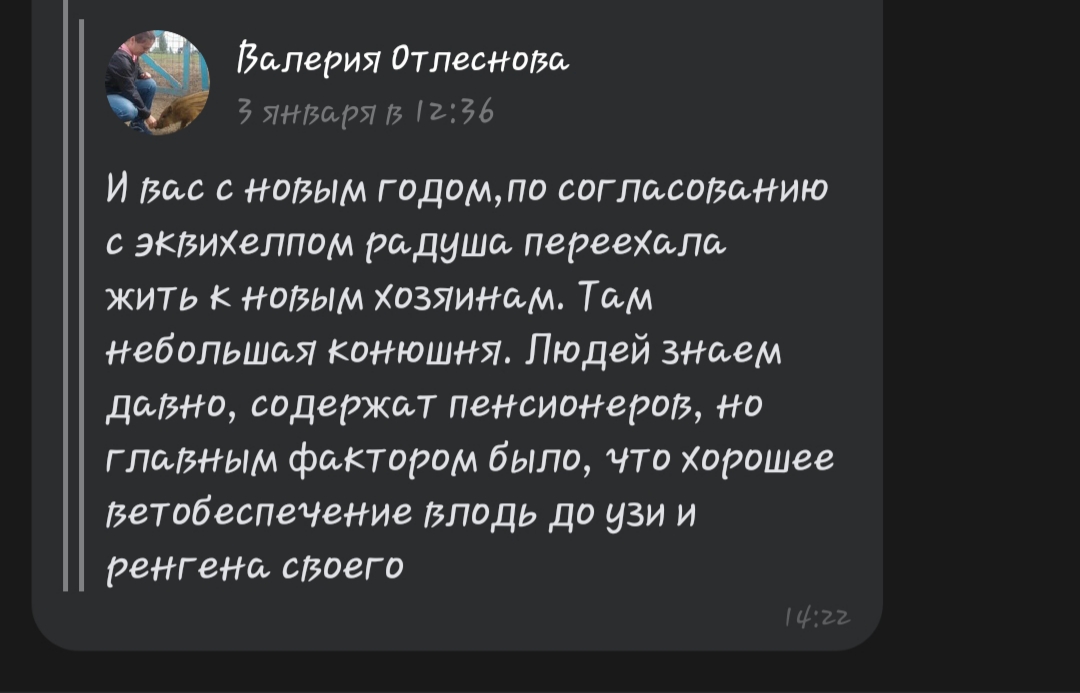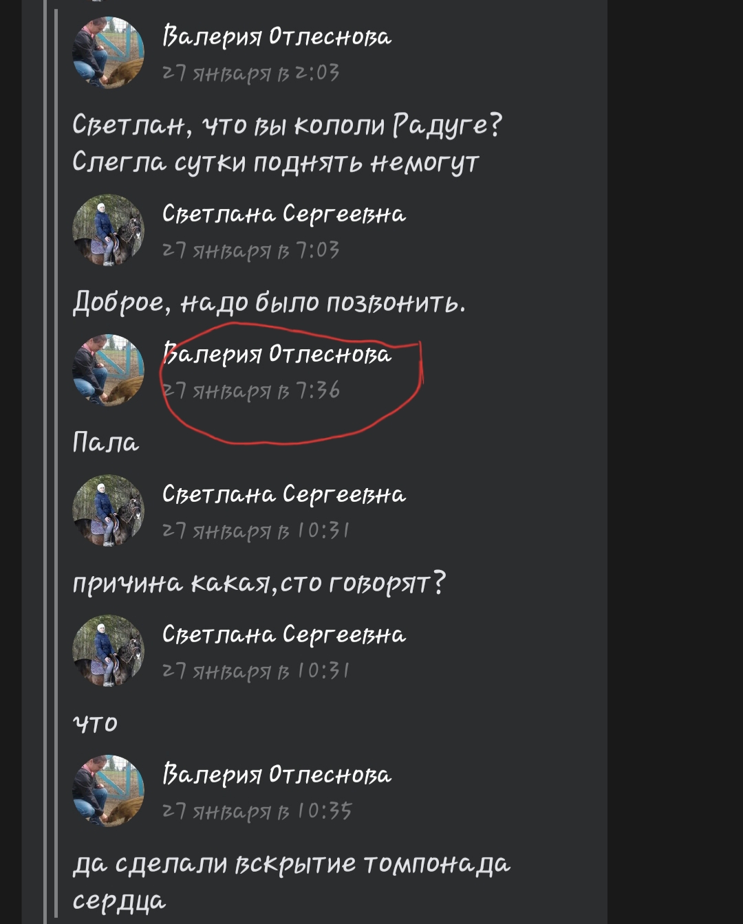 А эта тема, если я правильно помню, не про Люсю и то как ее эксплуатировали жадные бывшие кураторы, желающие зарабатывать на ней миллионы, высосавшие из неё последние соки и вернувшие назад(как это написали добрые люди в группе ЭХа вконтакте), а про клуб, в который люди одну за другой отдают своих лошадей на содержание, потом их оттуда куда-то вывозят и объявляют лошадей мертвыми, не предоставляя никаких доказательств.