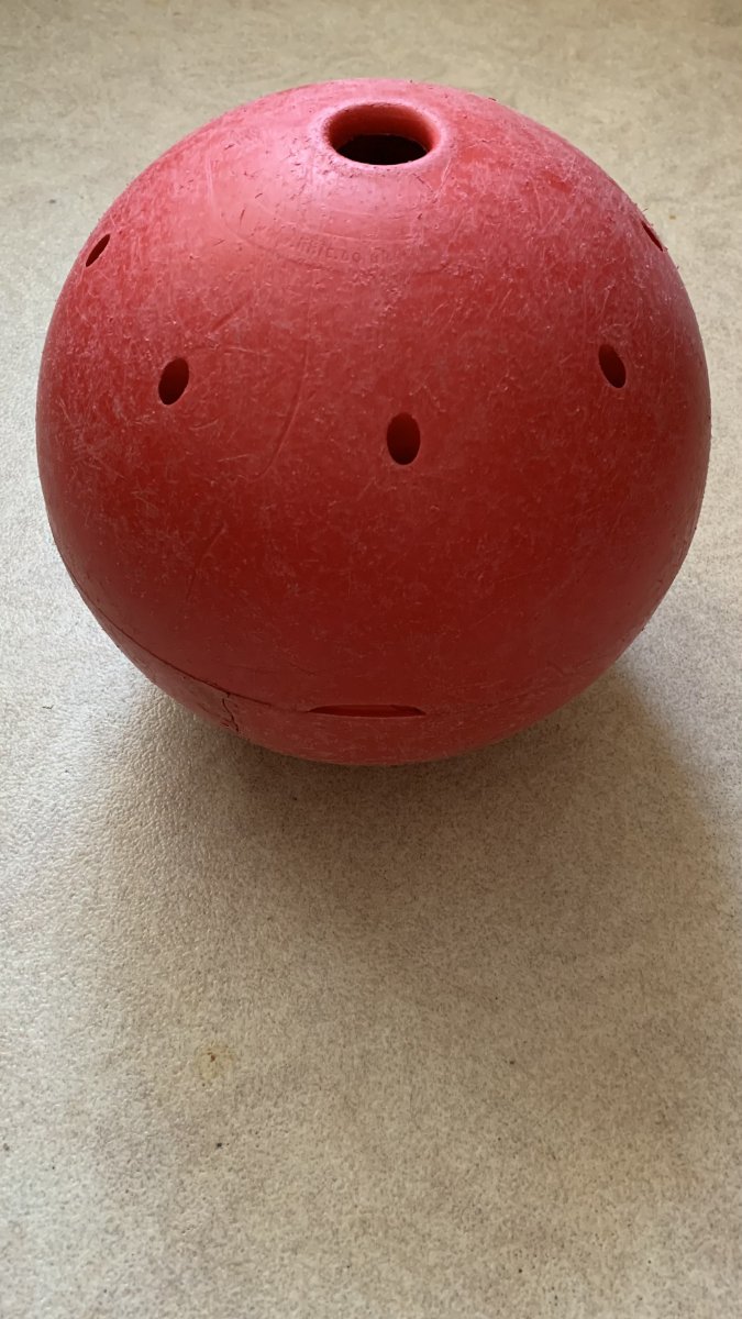 Продаю мяч Likit Snak-a-Ball. Неубиваемый, за 15 лет эксплуатации появилась трещина (скорее всего люди уронили на бетонный пол, лошади очень сложно как-то его повредить) - на работоспособность никак не влияет, я думаю мяч легко прослужит еще столько же лет. В комплекте две крышечки (одна запасная), хотя я всегда пользовалась без крышки.