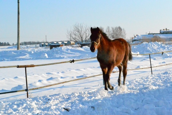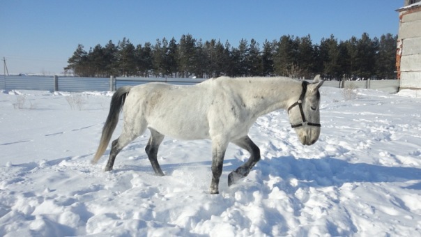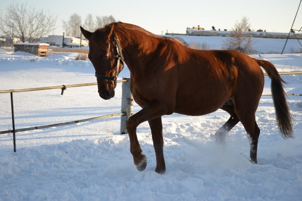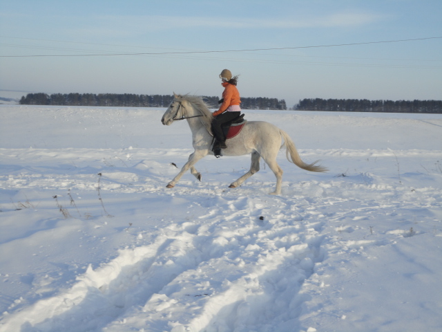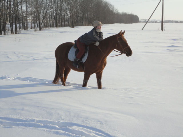 Бегом пошла за рыжим в леваду,завела,поставила на развязки и давай чистить.Почистила,поседлала,поехала попу морозить :lol: Федька порадовал,мы сделали две рыси по 10мин. и пришло время для галопчика...Я значит поводочик подбираю конь сразу шаг прибавил,головку мне сам опустил и идет...Поднялся с пол пенка с правильной ноги.Молодец :wink: Но я уверена,что конь меня обматюгал за тренировку:мало того,что от Моти его увела,так еще и в посадки потащила,а там так плохо,так плохо!Снег аж по путовый сустав...как мы там не утонули только :lol: