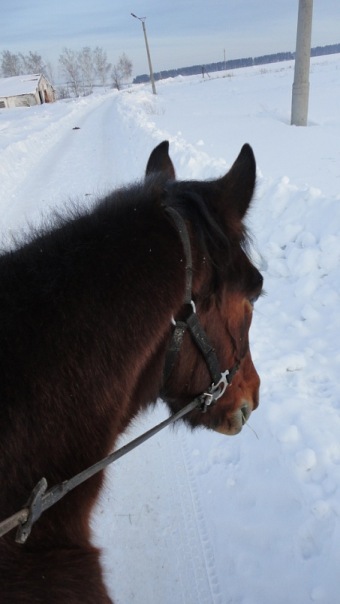 Потом завела Матильду,быстренько почистила и ПОДУМАЛА...Че время на седловку тратить,дай-ка на ней без седла и на недоуздке поездию.Недоуздок для нее - другие глаза,уши и...рот.Оказывается вокруг столько всего страшного,шумного,а главное вкусного!(Коровье сено)Ну она вроде сначало шла,периодически разворачиваясь к дому.Наверно проверяла.На рыси кобыль мне долго впаривала,что она не та лошадь,которая нужна мне для этих занятий...Короче так и рвалась меня быстро,быстро покатать,чтоб на долго хватило :lol: Я даже терпела и не ругалась,просто молчком ее на вольт выкручивала.Решила с ней на платцу позаниматься,так вроде безопаснее.