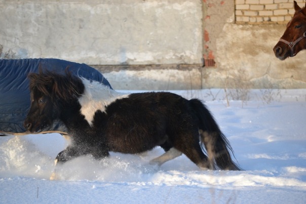 Затем 2-3 зимы подряд приходила на городскую площадь поняшек водить.После окончания прокатного сезона поняшек и лошадей нужно было перегнать в конюшю.Ну т.к. я и моя подруга были достаточно маленькие(нам было где-то по 11лет),нас то и посадили на тех самых поняшек.Поездка была долгой и забавной.В первый же раз я познакомилась с поняжьем галопом. :D