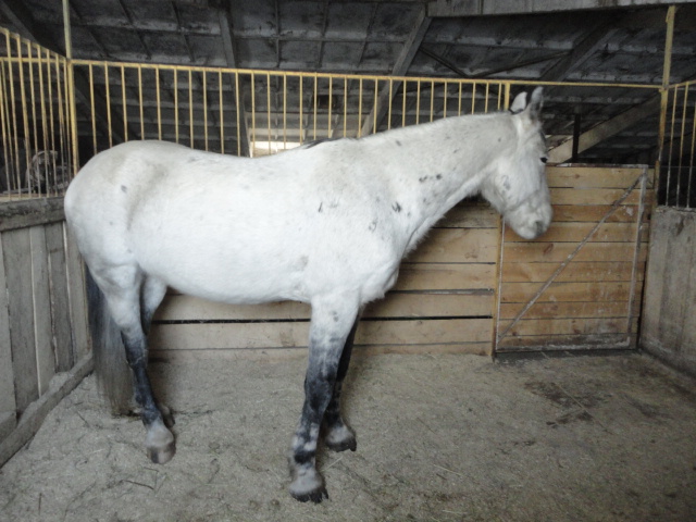Ну я почти уже около конюшни и тут мне на встречу идет КОНЬ...С виду похож на Пахира,но больно уж накачанный.Это оказался Малыш-колхозный тяжик.Он к нам забегает в гости раз в месяц,проверить как тут у нас дела.Точнее не забегает,а сбегает от своих "хозяев".Коня честно говоря жалко!Стоит целыми днями один в коровнике без выгулов.Только иногда его запрегут в тележку и рысью с очередным грузом по асфальту погоняют.Копыта отросшие,сам грязный,один глаз припухший. Да и видимо что-то с животом,т.к. он часто крысился и поджимал живот.. :cry: