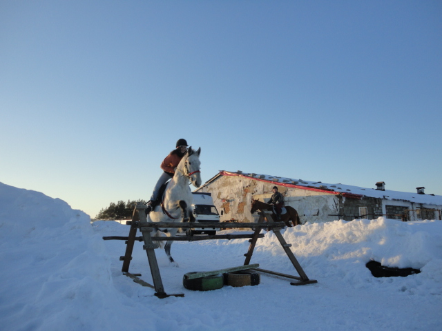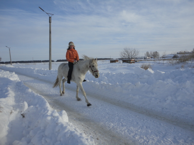 Погода нам как раз подфартила...был холодный ветер и снег.Доехали тихо мирно.Я была на рыжем+на мне два мешка с вещами болтались.Ну там щетки,мои парадные вещи и т.д.На сером был Андрей-мальчик 12 лет.Он тоже у нас занимается.