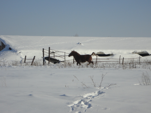 После Саши я почистила Мышь,Федьку и Пашку.На чистку Лаврика и Пахира плюнула :( Ну потом я завела Пашку с Федькой в конюшню от греха подальше,поставила Пашке кашку,выперла Лаврентия,Меги и Пахира на улицу,вытащила поседланную Мотяку и поехала с ними на тренировку.Лавриковскому счастью небыло предела:он бежал сам за своей любимой кобылью :lol: Наверно для его возраста это самый оптимальный вариант.Но Меги ему даже близко к мамке подойти не давала.Вот облом!Пока ехала до посадок рассматривала местные достопримечательности-коров.У них левада разделена на две части.Я так понимаю в одной части у них коровы для родео,т.к. то небольшое количество коров вэтой леваде козлило.А во второй части-конкурные,они там все через сугроб сигали :lol: