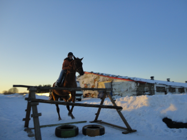 Мы с НН таскали стойки,а Андрей седлал Федю и Пашу.Потома мы с Андреем поехали коней разминать.С собой взяли Сашку и Пахира,но Пахир вырос,понял что к чему и не пошел с нами.На второй рыси начала рыжего подбирать.Конь молодец,головку отдал и прибавленной рысью побежал :mrgreen: