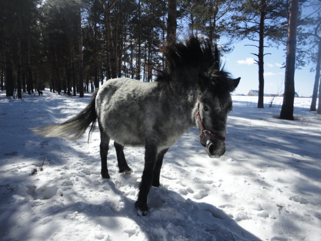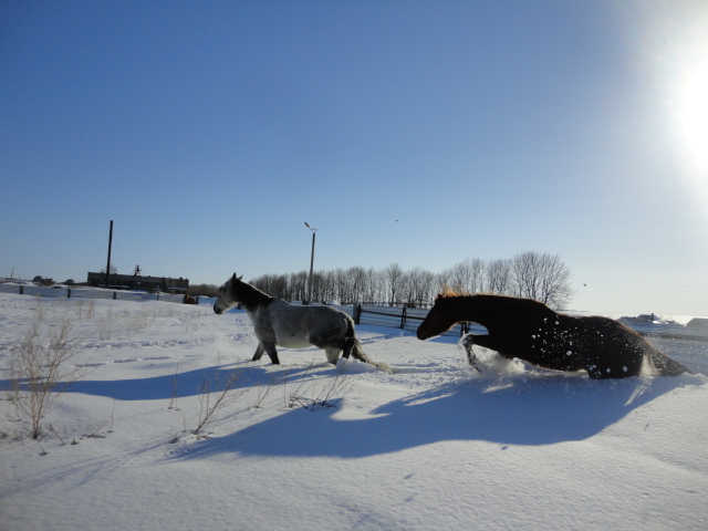 У меня прокат вообще веселый получился...Я была на рыжем,а девушки на серых.Объездили все и вся!И в посадки заехали,и по Куликовке проехали(богатое село,там у всех двухэтажные домики стоят)..Рысили немного.Девушки уже умели облегчаться,хоть и сказали,что они первый раз.После долгой прогулки по "рублевке"(Куликовке) мы поехали в сугробы...Точнее я смотрю там уже травка торчит-значит не глубоко. Федька пока по сторонам глазел сошел с тропинки и провалился.А может и сам упал,т.к. вставать оно никак не желало.Пока полежал,моську об снег почесал,а потом уж так и быть-встал :lol: После этого у него появилась фобия на сугробы...Прыгал через все.Девушки только над нами угарали.Им то хорошо с серыми-они и там пройдут,и там пролезут,а мой гад!