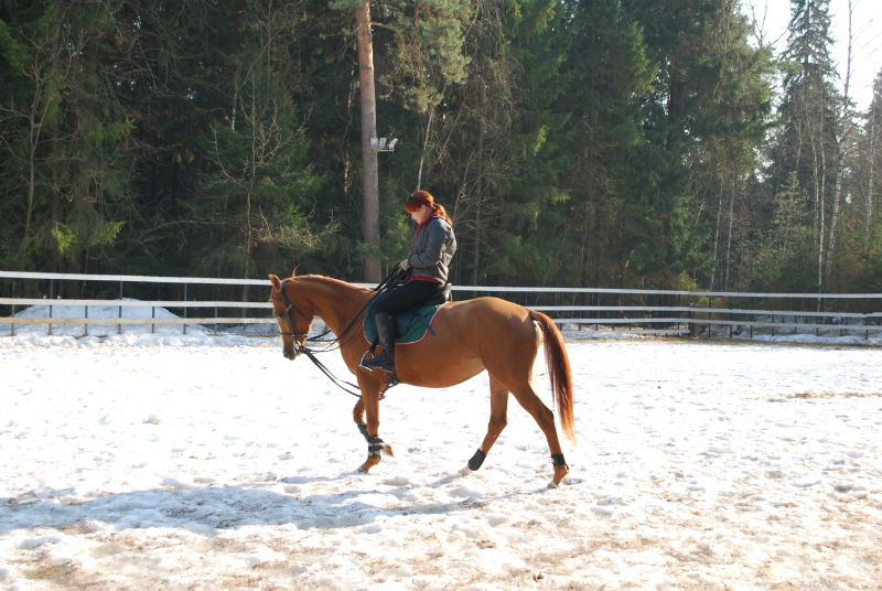 С кобылой я начала работать в МКД после продажи Малыша. Тренера у меня в тот момент не было, и я вспоминала старые уроки. Сидеть то мне сиделось, да и ездилось хорошо, но взгляд со стороны конечно впечатляет. Ужас ужасный))