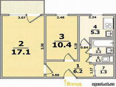 тебе принципиально сохранение стенок? если такое маленькое пространство, я те предлагаю выстроить стенку справа.. объединить три помещения с/у в один. выстроить стену у входа в кухню. и сделать проход через маленькую комнату.