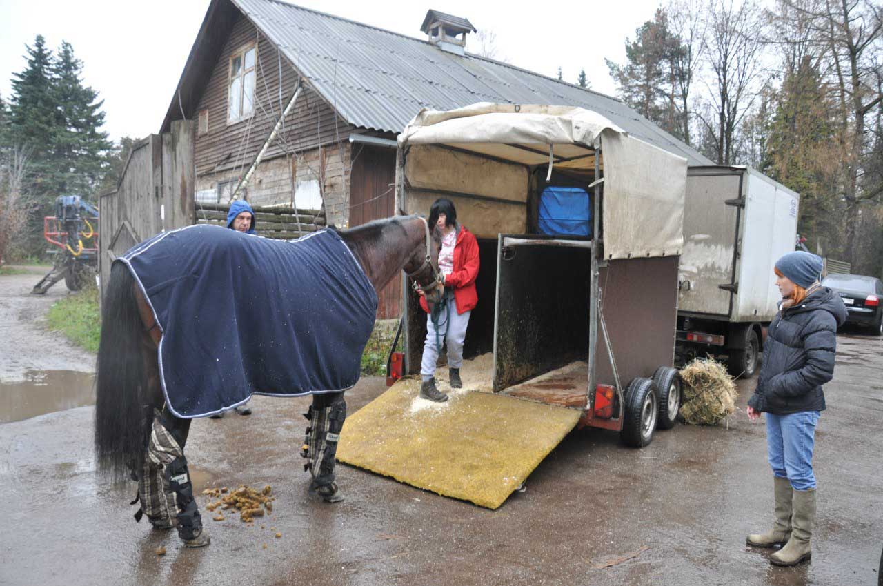 Выводимся, видим коневоз. ВП вкопался. Маша с ним поворковала, и спустя 15 мин он поставил передние ноги на трап. Я набрала еды и стала приманивать гада из коневоза. Но жрать он по ходу не хотел совсем... Через час примерно мы достигли некоторых успехов - все 4 ноги стояли на трапе, коневоз был обнюхан, обфыркан, но внутрь конь не собирался вообще. Он спокойно жрал рассыпанное внутри машины сено, но не делал ни шагу вперед, а при малейшей попытке ему помочь - радостно выгружался обратно.