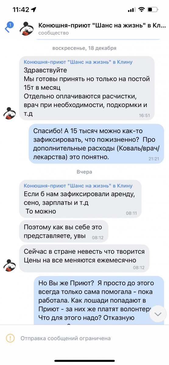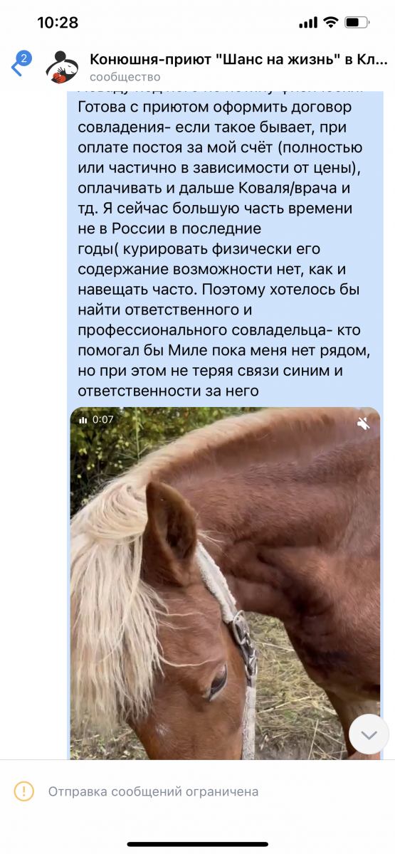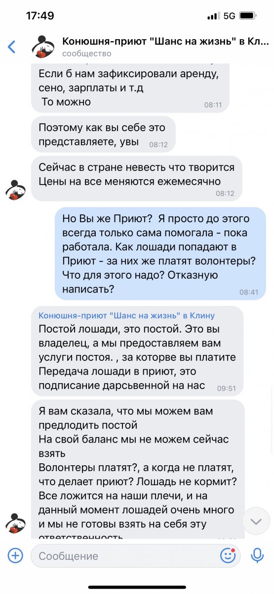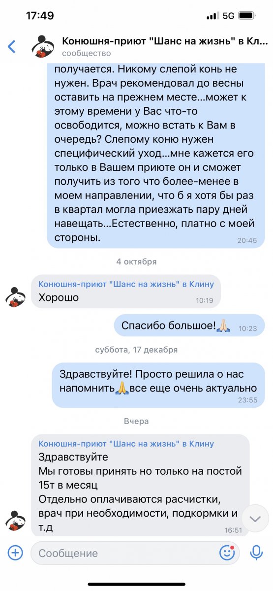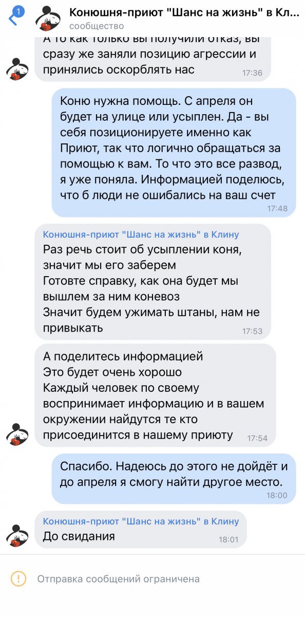 Вообщем, описав всю ситуацию и умоляя принять слепого коня с договором совладения в приют при продолжении моей оплаты ежемесячной в размере 15000, получила только предложение коммерческого постоя за 15000 и непонятно, что будет завтра- без фиксации цены.