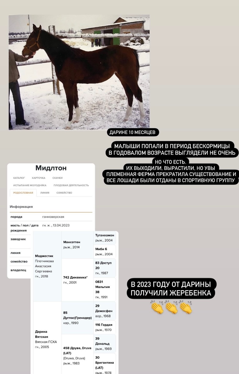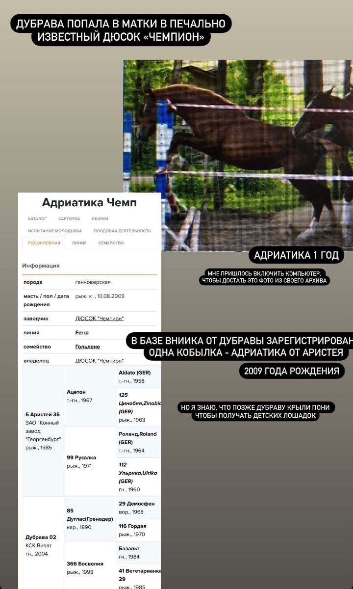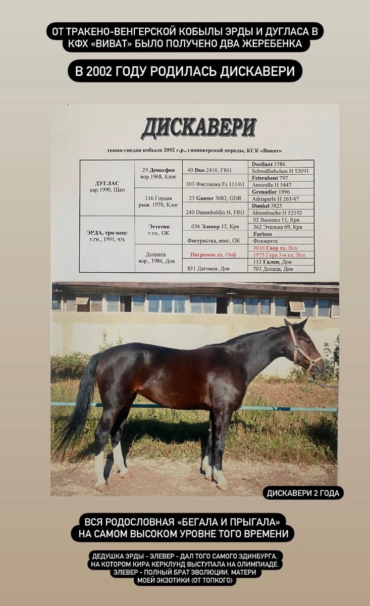 Экзотику купила Годованчук, Эрду как раз директор. Ее хотели на мясо, по мясной цене, покрыла ее Радием (ЧК), и она, уже будучи жеребой выросла до нормальной лошади окончательно.