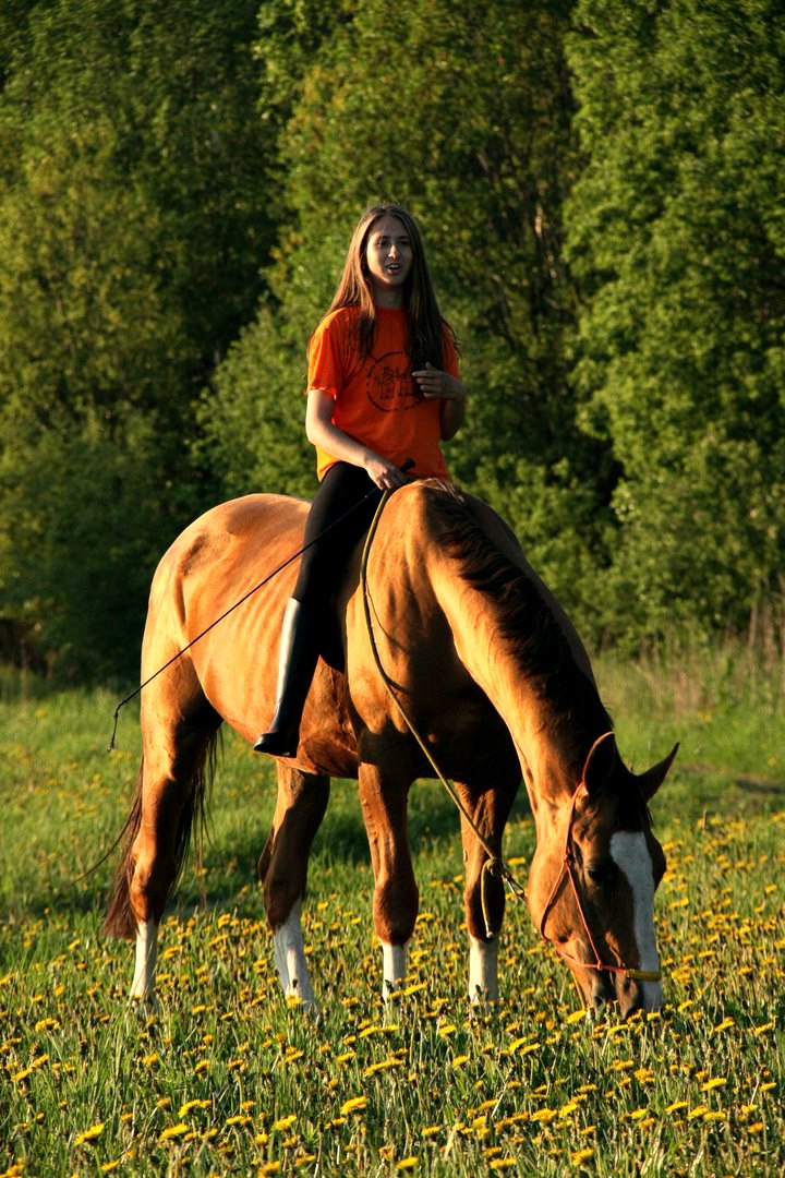 Несмотря на то, что это было воскресенье, в конюшню я приехала аж к 5 часам вечера. Пока почистила Рыжего, пока поседлала, пока на манеж вышли, время уже было часов 6.