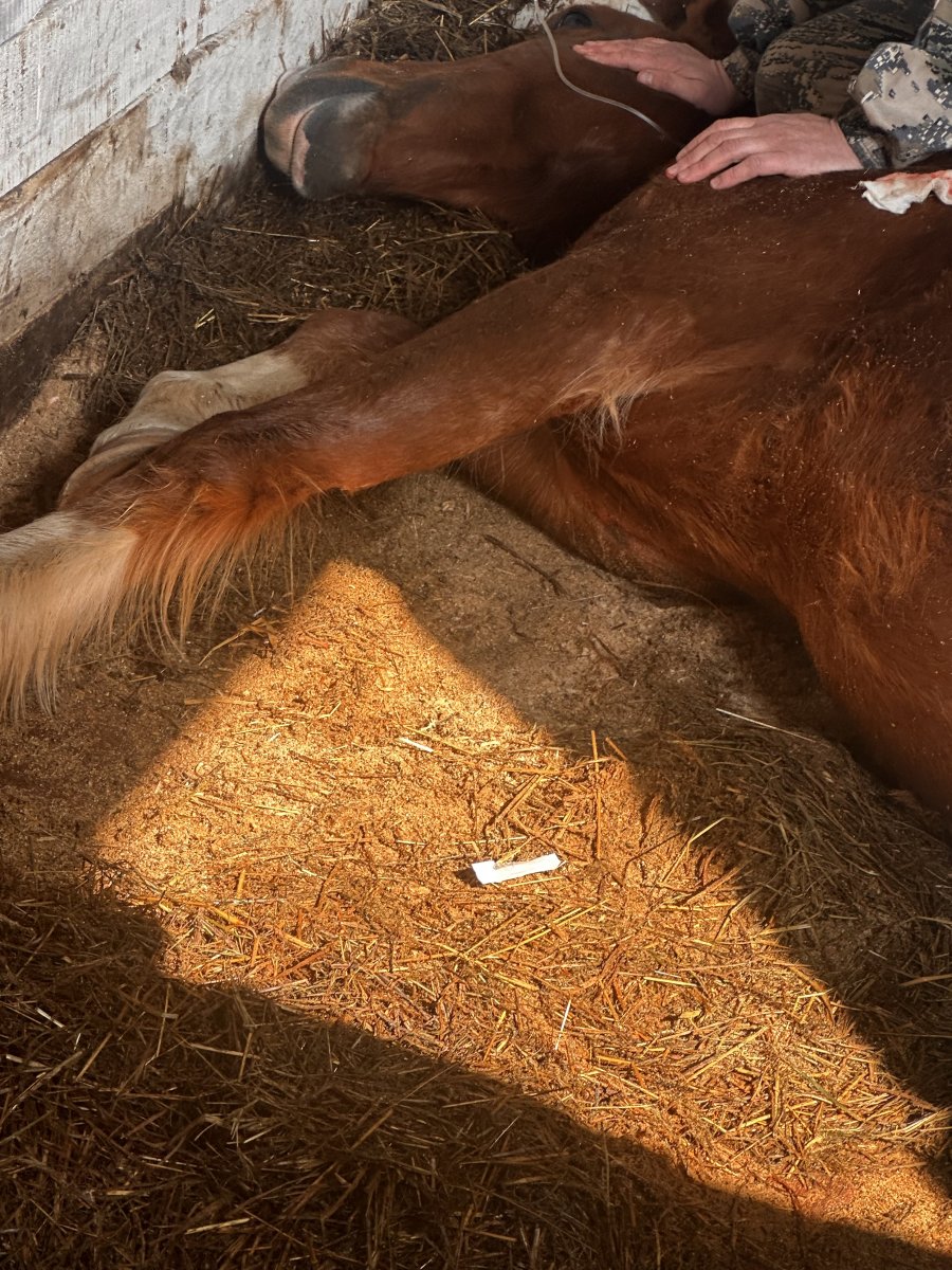 , и во время расчистки второго копыта случилось то, чего не кто не ожидал. Так в промежутке между восьмью и девятью часами вечера 6 апреля начался наш долгий путь в лечении Венеры. После падения она не могла встать. Что послужило причиной плохого самочувствия, не могли определить ни местные ветеринары, не приезжие. Первые сутки были самыми тяжёлыми, так как из-за того, что все произошло вечером, ей не смогли оказать должной помощи, так как ветеринары не смогли приехать и кобыла пролежала 15 часов. Для того чтобы у нее не появились пролежни, и она не залеживалась на одной стороне, ее постоянно переворачивали. На утро приехал ветеринар, который тоже не смог понят причину падения, так как в практике подобного не случалось. Было много вариантов, из-за чего кобыла упала, но как оказалось позже, во время родов жеребенок, еще находясь в утробе матери, повредил ей мышцу, которая отвечает за загибание и разгибание задней ноги. Ей были поставлены капельницы, уколы внутривенно. Так же растирали задние ноги и круп лошади камфорной мазью для того, что бы разогреть мышцы. Когда ветеринар закончил, приехала кран-балка и подняла лошадь, после чего через подмышки и паховую область были проведены стропы и прикреплены к потолку для того, чтобы они поддерживали лошадь, если та начнет падать.