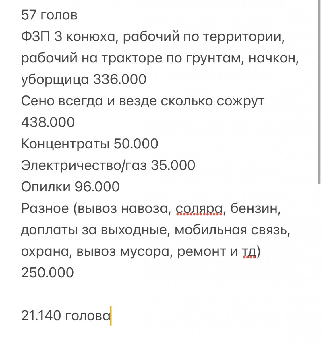 В эту сумму считали: зп начкона, зп конюха, зп разнорабочего он же ночной, корма (сено (вволю!!!! всем!! всегда!!), овес, отруби), эл-во, вода (это копейки на КФХ, но они капают), инвентарь (тоже копейки потому-что не так часто закупался, но все же), опилки, небольшая сумма закладывалась на починку/замену всяко-разно, уборщица (5000 р./мес.), вывоз мусора.