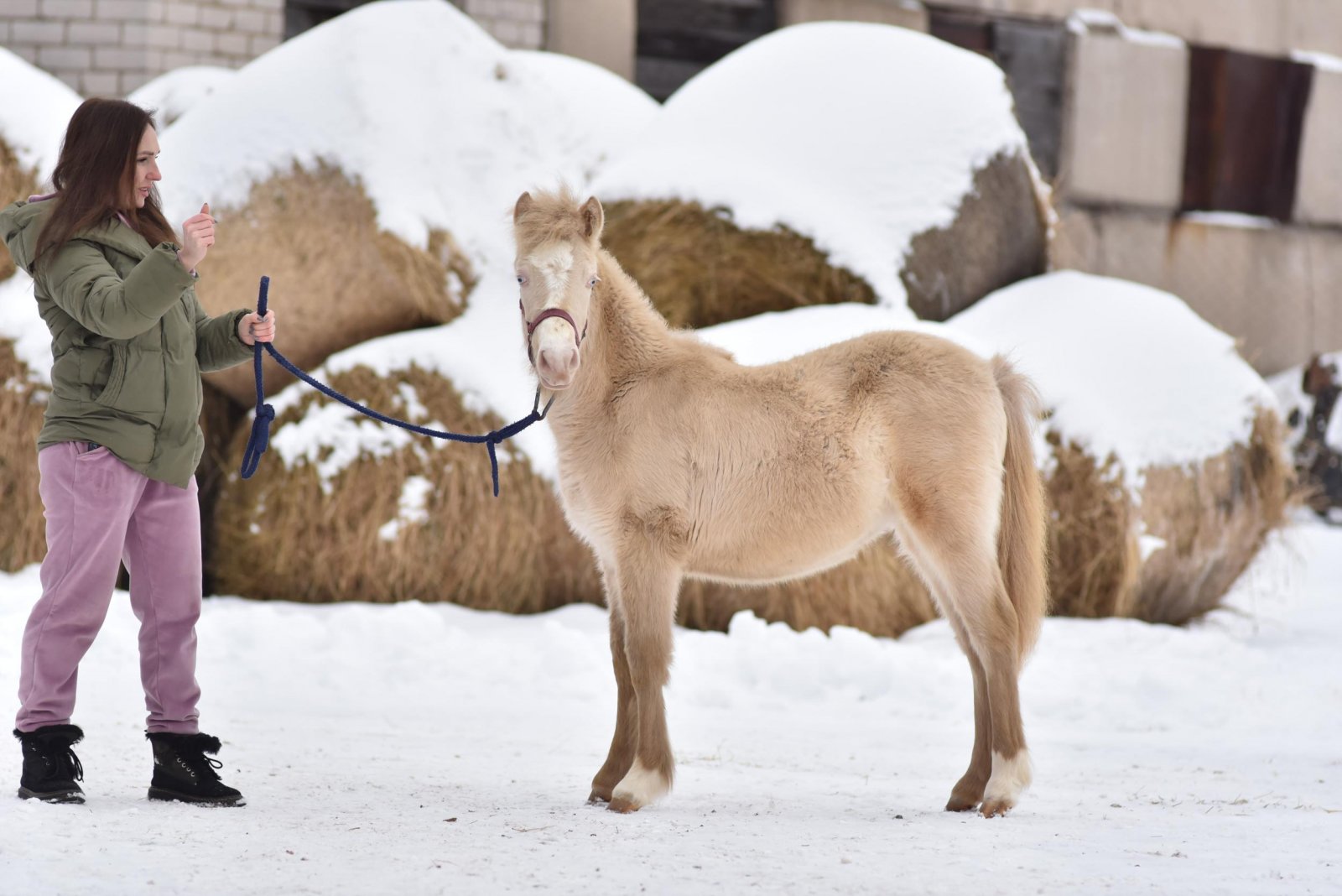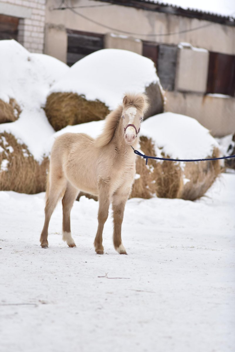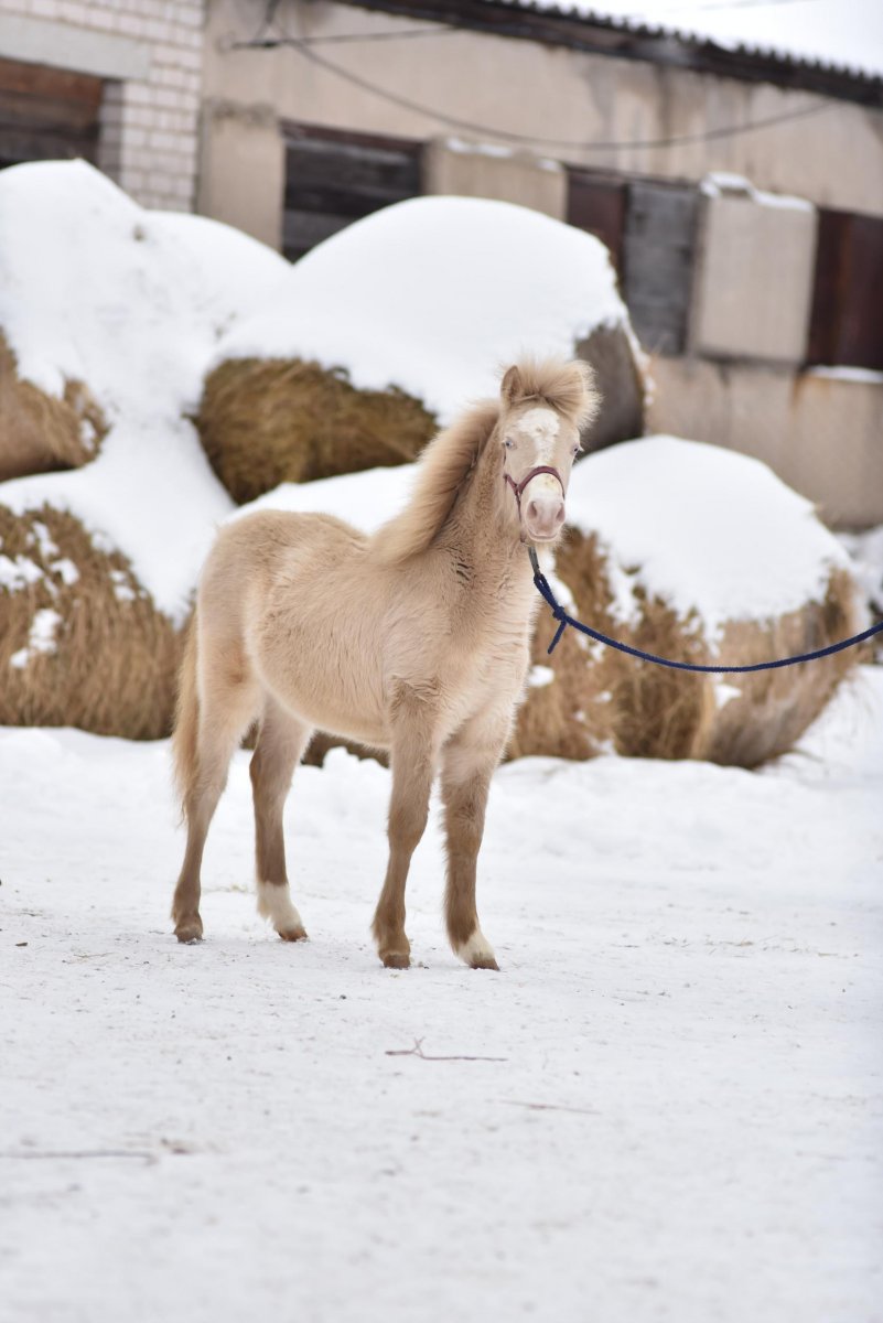 Кобылка рождена 6 мая 2022 года ( полных 9 месяцев) рост на данный момент 108 см, масть Изабелловая ( голубые глаза), очень ручная, ласковая, опорожнена, расчишается, чистится, стоит на развязках, мама и она получают все необходимые подкормить!