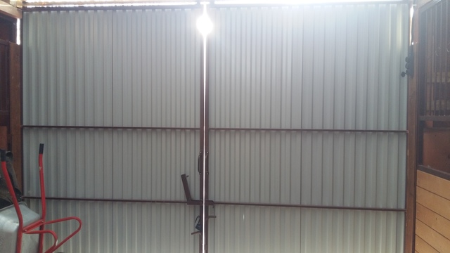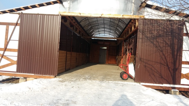 Текущее время года (декабрь 2017) предсказало основную особенность данных ворот- для них не нужен фундамент! Мы спроектировали направляющий сверху, продумали его регулировку по всему ходу каждой створки ворот (более 6 метров), установили ролики, а внизу сделали лишь уловители по ходу движения створок. Петли для замков, фиксаторы нижней части в закрытом положении, секретки для доступа только знающим людям на конюшню и ВУАЛЯ!