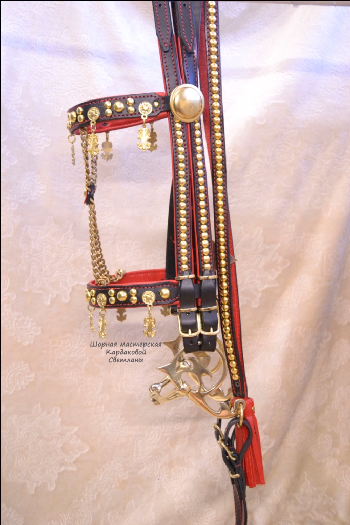 Двойные нащечные ремни, фигурный повод, подгарок из кожи с обратной стороны подшит красной кожей что бы были закрыты усики пукли.