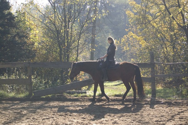 Я подсела сама, что понравилось... Милан смог опустить голову галопом налево. Раньше при опускании головы на галопе он вытягивал плечи а зад оставался откляченым где-то там и больше нескольких темпов он так пробежать не мог естественно, а тут нос опустил, плечи на месте остались и пол круга (больше не просила) без проблем Милан прошел как часики. Переходы в шаг у меня получались чуть получше, но поработать над ними еще надо будет.