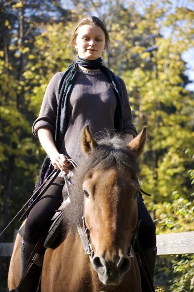 Субботнее утро началось с прогулки в лес :roll: , мне даже удалось сегодня верхом поездить на Милане. Собралось нас много, целых 4 человека. Бу-бу был головным по ряду причин. Вполне не плохо покатались средней рысью, ехала на трензеле и просила хомячка опускать голову вниз. Он опускал, поднимал, снова опускали так все время, стабильности как таковой не было.
