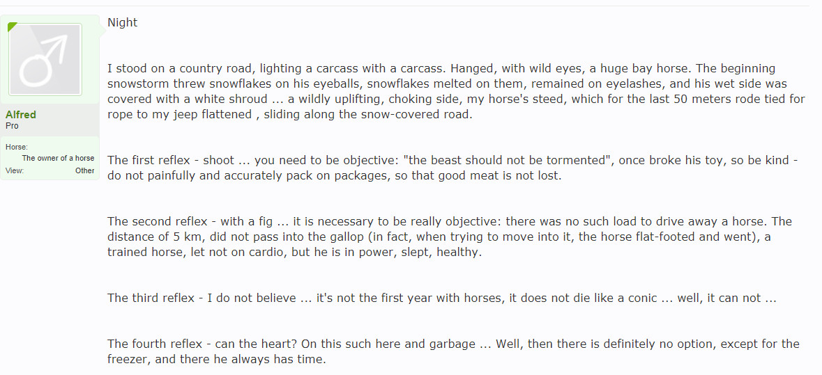 С мнением Trof не согласна. Своё отношение к личности автора дневника я высказала в личку. Я не поддерживаю ни подобное отношение к животным, ни к форумчанам, каковое демонстрирует Alfred.