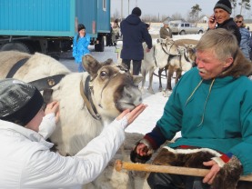 Эрчим всегда у меня боялся оленей, до жути, до дрожи, до нервных срывов. Когда я работала на проводы зимы, а Таня с Сашулей выходили работать в санях на своих оленях на площадь...у нас начинались нервы. Шея лебедем, хвост как у арабского элитного жеребца, грудь вперед, ноги в пляс, а сам трясется, жмется.