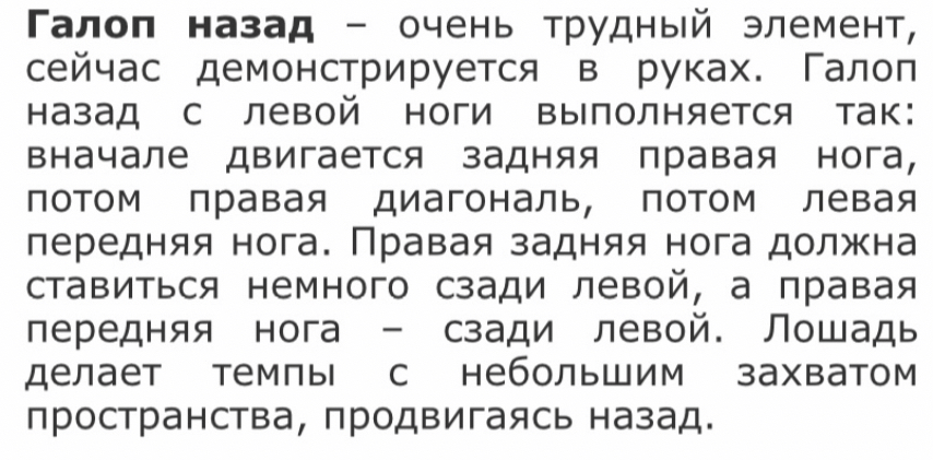 Перед этим нужно освоить сокращения, научиться поднимать лошадь в карьер и сокращать практически до галопа на месте- галопады. Опять же перед изучением нужно выучить сокращения и только потом приступать к её изучению. При этом она отличается от обычного сокращенного галопа тем, что лошадь очень сильно подводит зад, что нам очень пригодится на галопе назад, также как и в пируэтах, в них лошадь практически галопирует на месте, но не назад, а также сильно подводит зад.