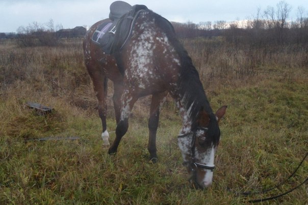 Гнедой тракен: лысина поменьше, чем у Перепелки, ПЗ криво бела чуть повыше путового сустава, и все.