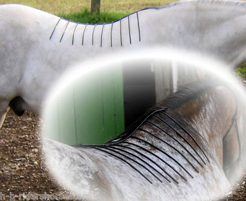 Gitter hinter der Schulter mittig auflegen , Stäbe entlang der Rückenform des Pferdes biegen, so das die Stäbe gleichmäßig anliegen und aufliegen.
