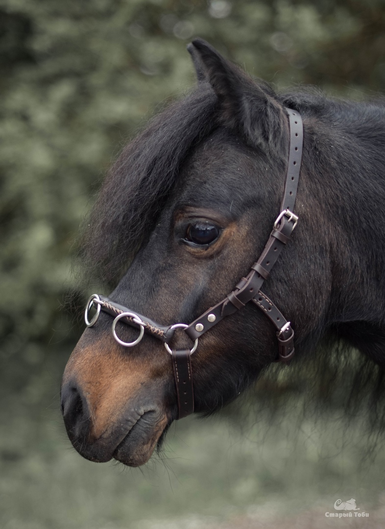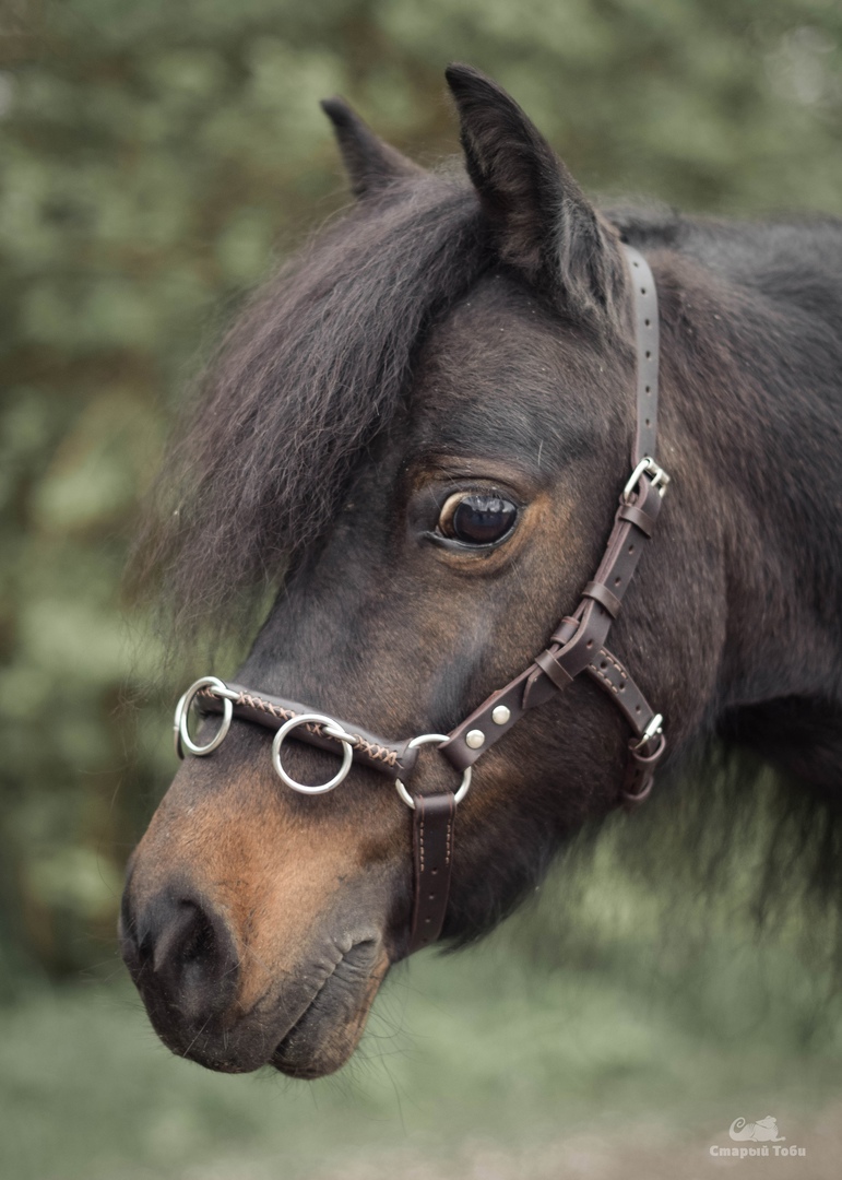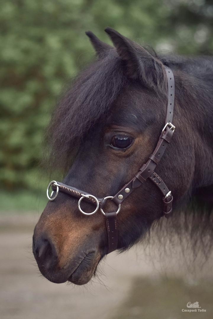 Кожаный кавессон тёмно-коричневого цвета с серебристой фурнитурой, с однослойными суголовными ремнями, без ремешков для трензеля, для пони или минихорса (на охват носа 36-51 см). 4500 р.
