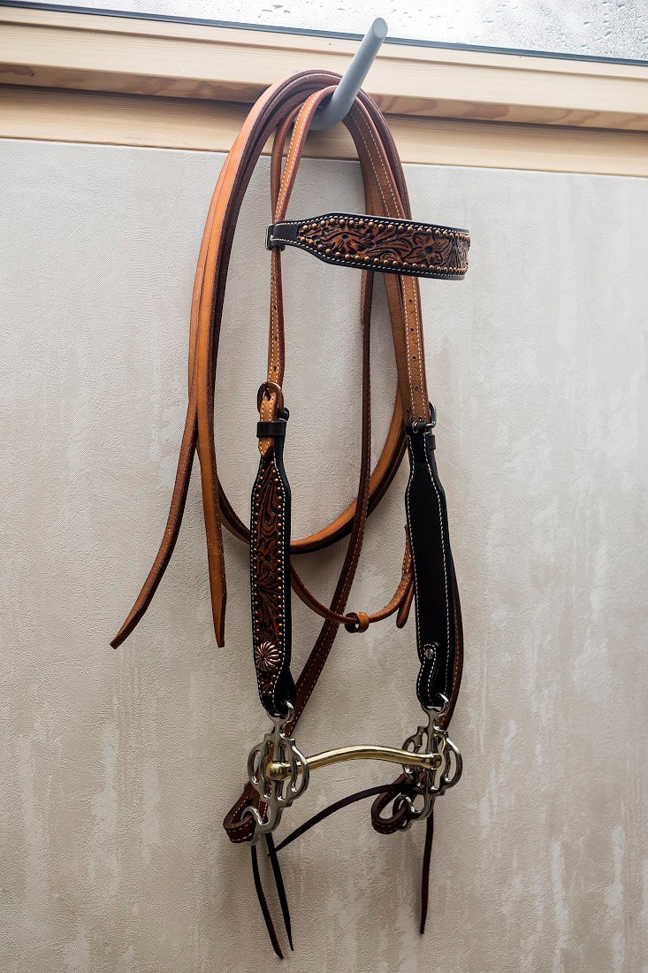 Оголовье, повод и нагрудник куплены в США, пелям - из Англии. Собирала себе красивый комплект, но пелям коню не понравился, нагрудник на фризский грудак маловат и в результате оно висит декорацией дома.
