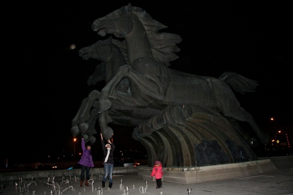 Мы только лошадок в шинки запрягаем и они нас катают, тоже саней нет