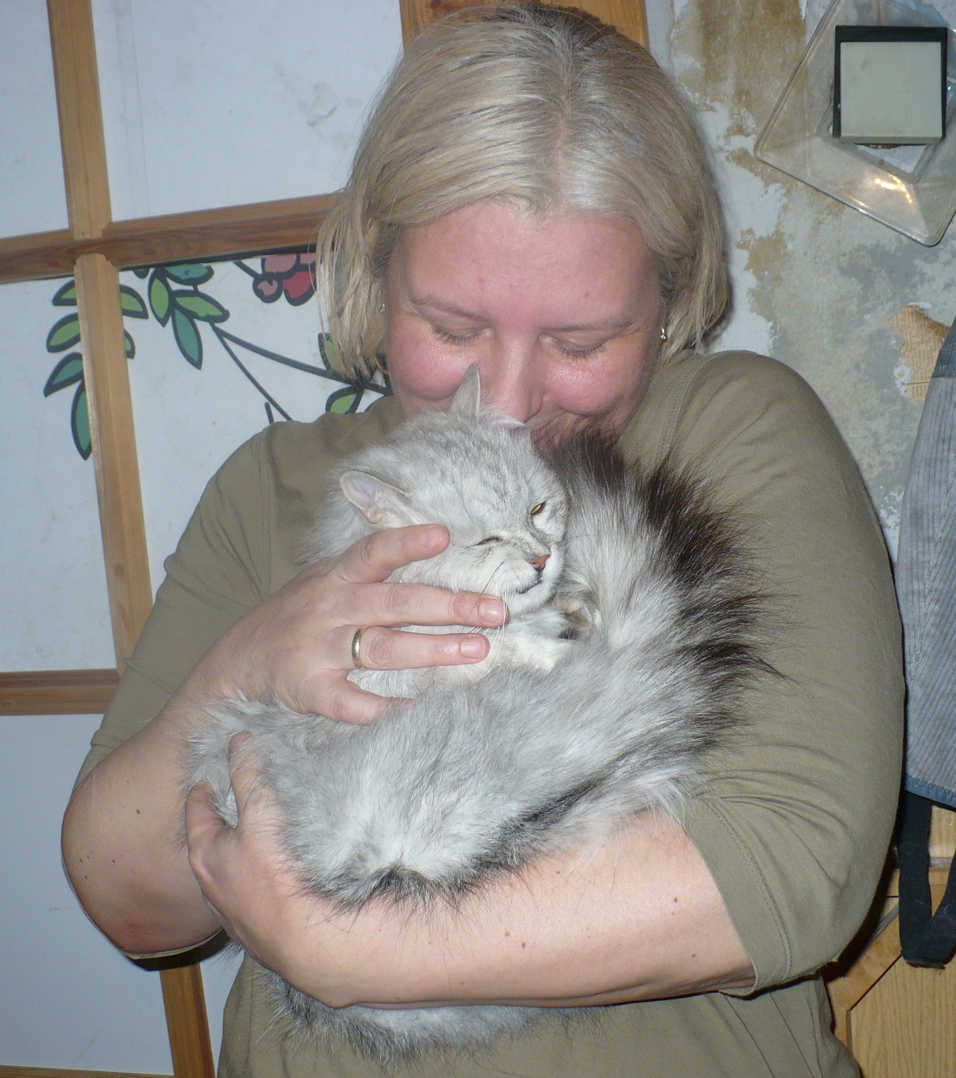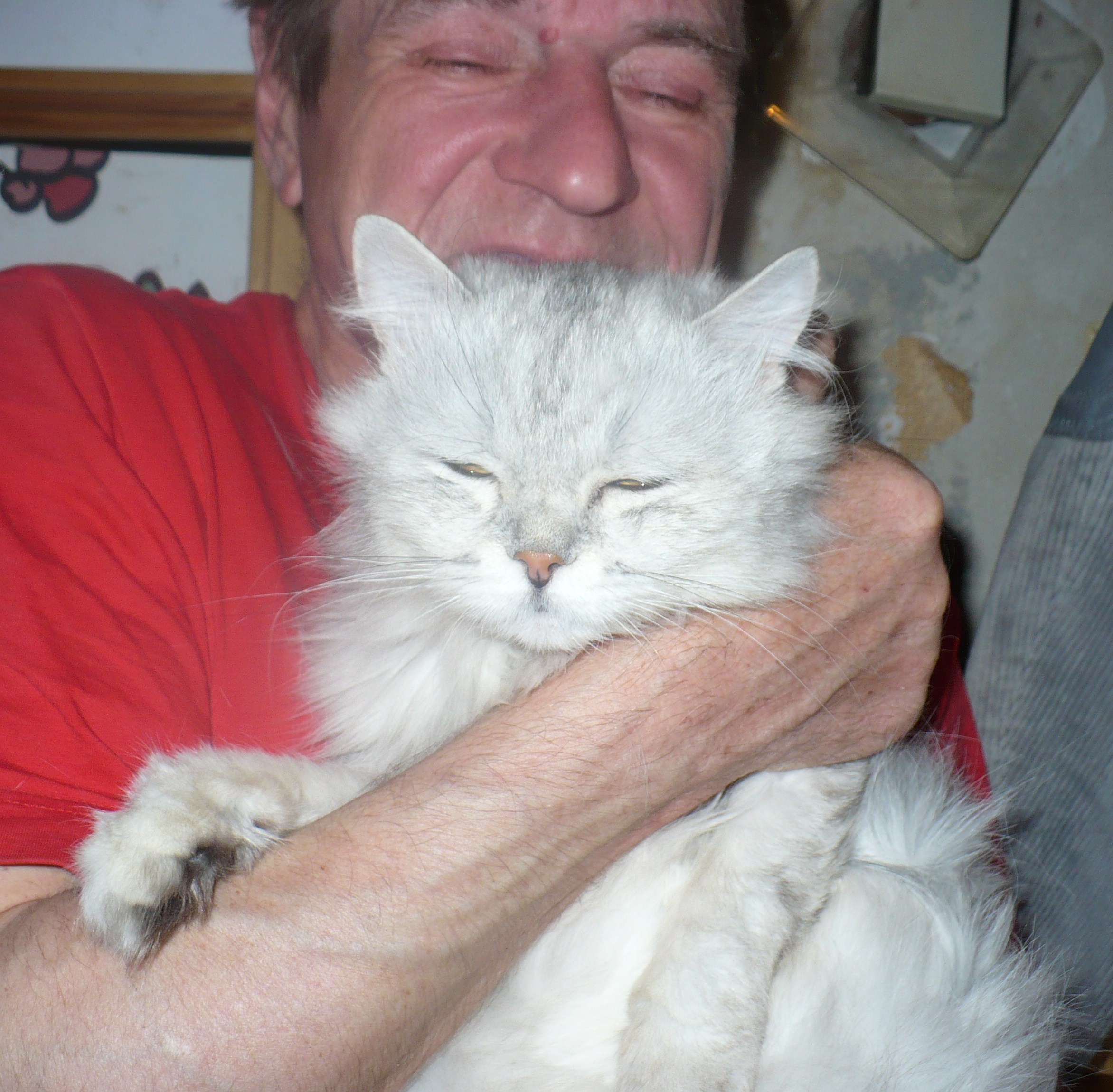 А чтой-то я только Чикиту сфоткала..Вот фотки в похожей ситуации с Маркусей. Сегодня перед дачей микстуры уговорила ее на руках посидеть,а Володю уговорила нас щелкнуть. МАра - не крупная. Средняя кошка . 4,5 кг.