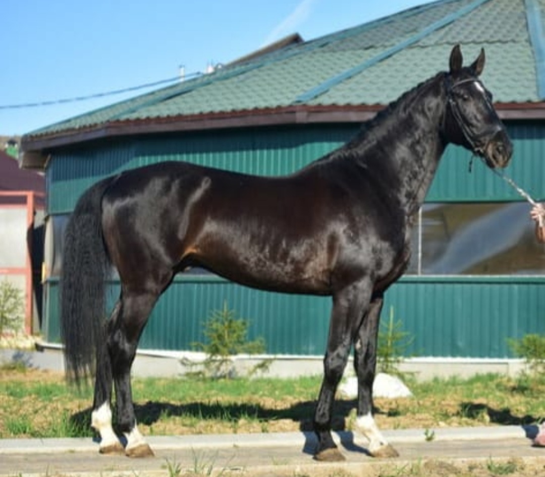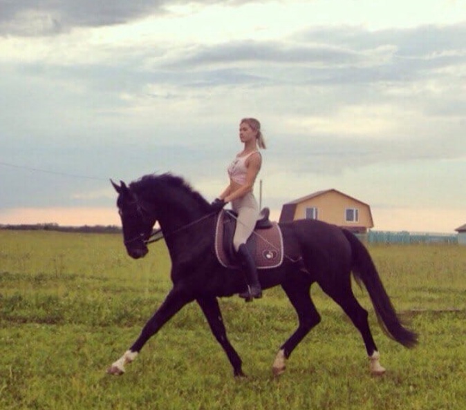Широкая кобыла на просторных движениях, обладательница ярко выраженного затылка, довольно высокого выхода шеи, уравновешенной психики и любопытного нрава - всё новое воспринимает "на ура". Ничего не боится, от слова "совсем".
